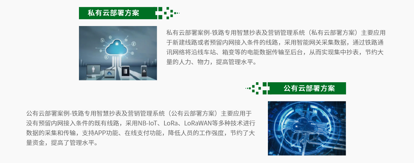 铁路专用智慧抄表及营销管理系统可部署在公有云服务器(阿里云、华为云等)或私有云服务器(供电段、供电车间的数据中心或机房),对管辖范围内的电表、水表等进行远程采集,集中管理,综合分析。采用有线、无线、公网、内网、工业总线等多种通讯技术相结合的方式,可应用于新建、改造项目。