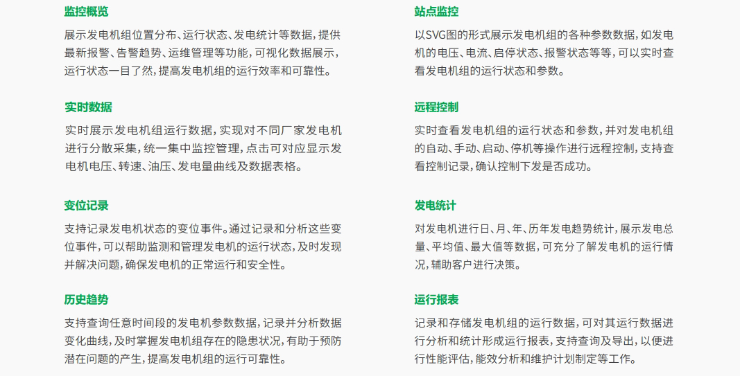 应急发电机集中监控系统由发电机监控装置和集中监控中心组成。发电机监控装置采集每台发电机、发动机的数据以及运行工况,通过无线或者有线的通讯方式实时传输至集中监控中心。 集中监控中心可集中监控发电机的运行工况,并将采集的数据进行存储,形成历史报表、历史曲线;实现远程参数设置、远程启停发电机;设备自动化管理,切实保障应急发电机的正常运行。