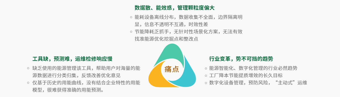 企业在生产运营过程中所用能耗大,各环节粗矿式经营,成本居高不下,无法准确定位关键症结所在。工厂能源管理系统解决方案对企业使用的水、电、热、蒸汽、燃气等各类能耗计量、分析,可更清晰地获悉不同设备、车间、产线、消耗等方面的能耗动态监控和数据化管理,帮助用户实现能耗统计分析,节能减排,避免“跑冒滴漏”现象,提高能源利用率,降低用户成本,提高风险预判能力。