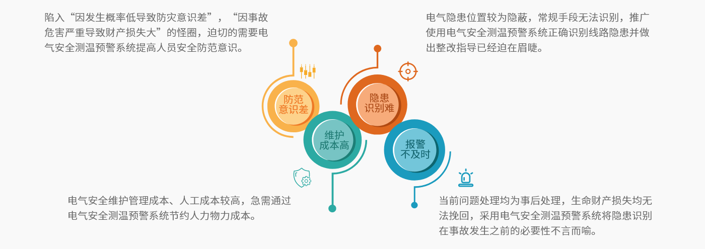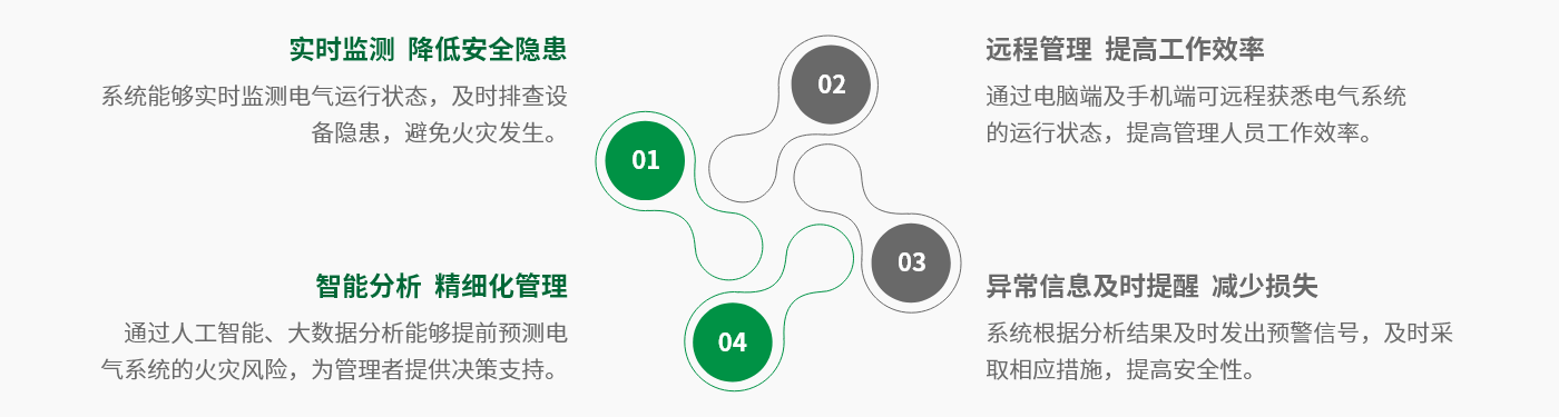 基于云计算、物联网、大数据、AI、自取电、超级功耗等新一代信息技术,对电气线路和用电设备进行不间断的测量,辅助监测电气设备温度,实时发现电气线路和用电设备存在的异常启停、安全隐患等现象,并对引发电气火灾隐患进行预警、分析,一旦发现异常,可即时向安全管理人员发送预警信息,指导其开展隐患治理,达到消除潜在的消防安全危险,实现“防患于未然”的目的。
